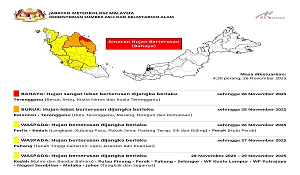 Amaran hujan berterusan di beberapa negeri sehingga 29 November