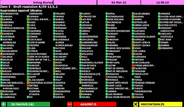 Resolusi itu menyatakan kekesalan terhadap pencerobohan Rusia di Ukraine dan mengutuk keputusan Presiden Russia, Vladimir Putin meletakkan senjata nuklearnya dalam keadaan bersiap siaga.
