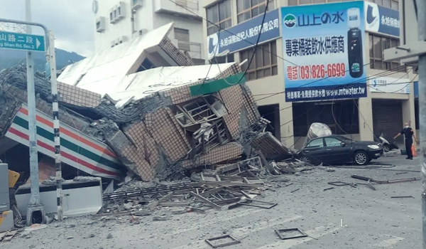 Di bandar Yuli di Taiwan, sebuah bangunan dua tingkat yang mempunyai kedai serbaneka di tingkat bawah runtuh.