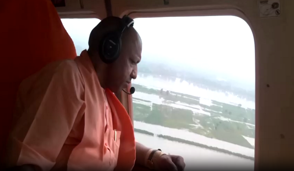 Rakaman daripada agensi berita ANI menunjukkan Adityanath meninjau lokasi kejadian dengan menaiki helikopter seterusnya melawat mangsa banjir.