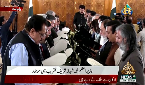 ISLAMADAB, 20 April – Barisan kabinet baharu Pakistan pimpinan Perdana Menteri Shehbaz Sharif mengangkat sumpah jawatan di Istana Presiden di Islamabad pada Selasa.
