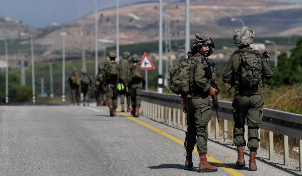 (Tentera Israel berjalan di jalan berhampiran sempadan Israel dengan Lubnan di tengah-tengah