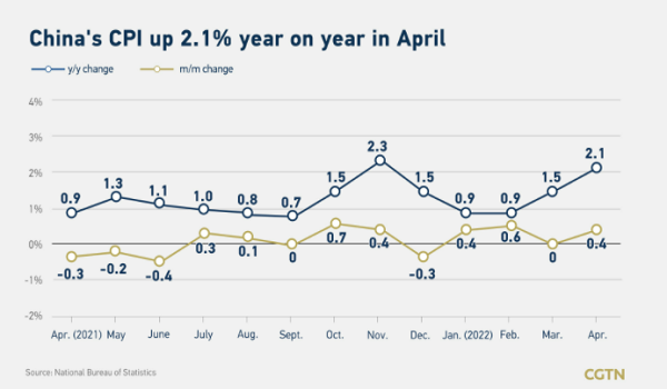 Indeks harga pengguna (CPI), iaitu pengukur utama inflasi runcit,meningkat lebih daripada jangkaan pada 2.1% pada April berbanding Mac, kata Biro Perangkaan Kebangsaan (NBS).