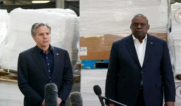 (Lloyd Austin dan Antony Blinken, bercakap dengan wartawan di Poland, selepas pulang dari Kiev, Ukraine/AP)