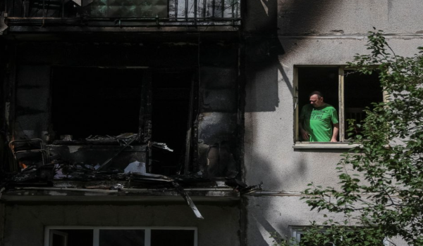 (Seorang penduduk tempatan melihat keluar melalui tingkap pecah di bangunan kediaman yang rosak