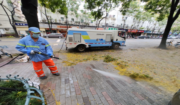 (Seorang pekerja membersihkan serpihan dari kaki lima selepas