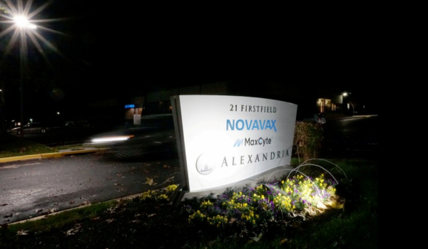 (Foto menunjukkan sebuah kereta melepasi papan tanda untuk pembangunan vaksin Novavax