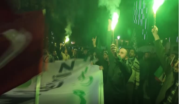 Penunjuk perasaan dilihat menyalakan suar serta mengibarkan bendera Turkiye dan Palestin.