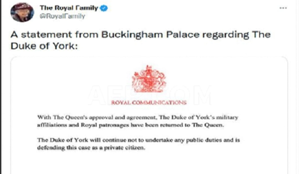 LONDON, 14 Januari – Istana Buckingham dalam satu kenyataan ringkas memaklumkan “Dengan kelulusan dan persetujuan (Ratu Elizabeth II), gelaran ketenteraan dan naungan diraja Duke of York telah dikembalikan kepada Ratu,”
