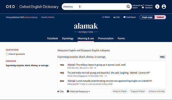 Tambahan lain ialah “alamak”, perkataan baharu dari Malaysia dan Singapura. Asal usul perkataan itu tidak pasti tetapi ia mungkin berasal dari bahasa Arab atau Portugis.