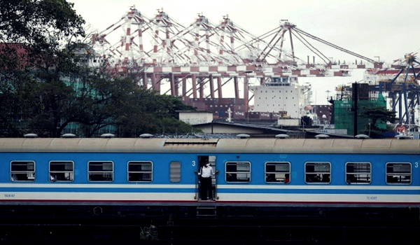 (Seorang lelaki menaiki kereta api di pelabuhan Colombo ketika krisis ekonomi di Colombo,