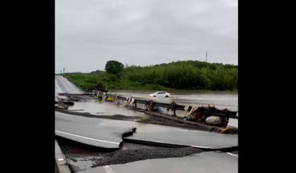 Rakaman video menunjukkan sebuah kereta melalui air banjir berhampiran jalan yang rosak teruk di tengah wilayah Aichi.
