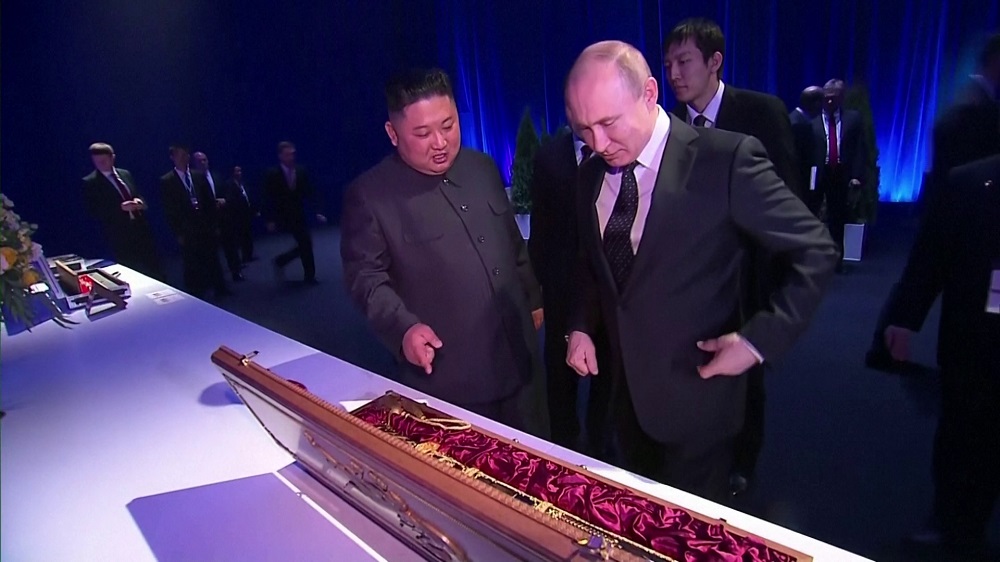 (Vladimir Putin (kanan) menerima pedang daripada Kim Jong-un (kiri) dalam satu pertemuan