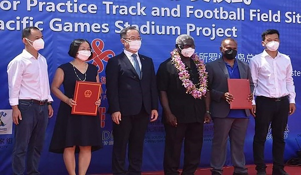 (Duta China ke K. Solomon Li Ming (tengah kiri) dan PM Solomon Manasseh Sogavare (tengah kanan)