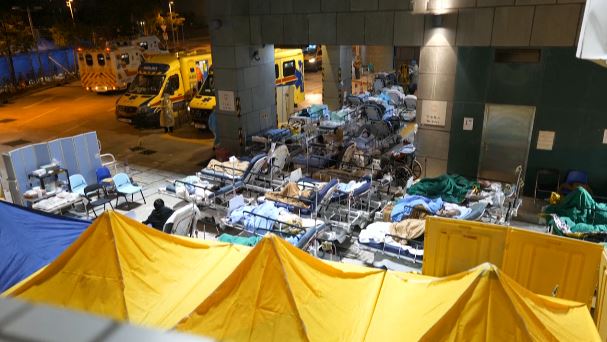 Berpuluh-puluh orang berselimut di luar sebuah hospital berhampiran kawasan termiskin di Hong Kong yang sedang menunggu rawatan.