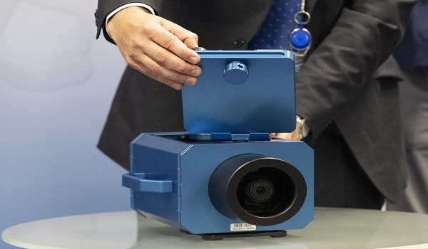 (Ketua IAEA, Rafael Grossi menunjukkan kamera pengawasan pada sidang media di Vienna, Austria mengenai perkembangan kerja-kerja pemantauan dan verifikasi IAEA di Iran/ AFP)