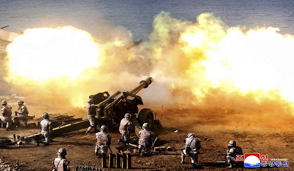 Rakaman yang disiarkan Stesen Televisyen Pusat Korea menunjukkan anggota unit artileri melepaskan tembakan ke arah laut, dengan Kim memerhati melalui teropong di sebuah pos pemerhatian.