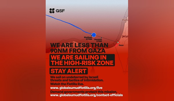 KUALA LUMPUR, 1 Oktober- Global Sumud Flotilla (GSF) mengesahkan mereka kini berada kurang dari 90 batu nautika dari Gaza dan berlayar dalam zon berisiko tinggi atau zon merah.