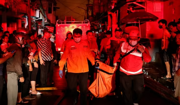 Saksi menyamakan kebakaran itu seperti letupan bom selepas letupan awal menyebabkan penduduk tempatan panik menjerit dan melarikan diri melalui jalan sempit dengan bola api menerangi latar langit Jakarta di belakang mereka. -AFP