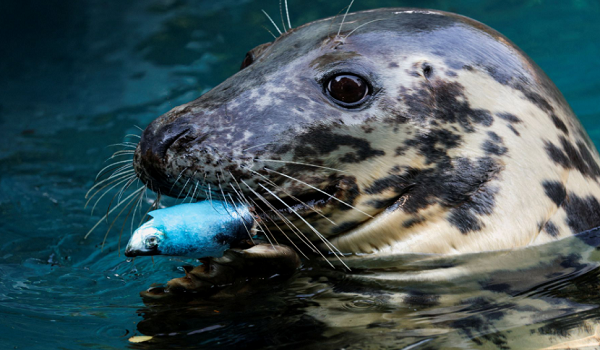 (Seekor anjing laut kelabu memakan ikan beku, semasa gelombang panas