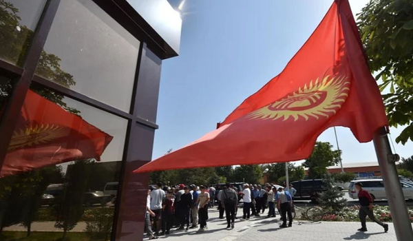 (Bendera kebangsaan Kyrgyzstan berkibar separuh tiang ketika orang ramai berkumpul