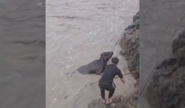 Rakaman video menunjukkan pasukan penyelamat menarik lembu tersebut ke darat menggunakan tali yang diikat pada lehernya, meskipun berdepan arus sungai yang kuat.