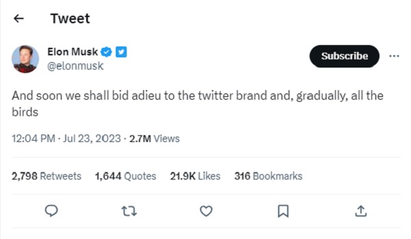 Menerusi satu hantaran Twitter, Musk berkata “Tidak lama lagi kami akan mengucapkan selamat tinggal kepada jenama Twitter dan secara beransur-ansur, semua burung.”