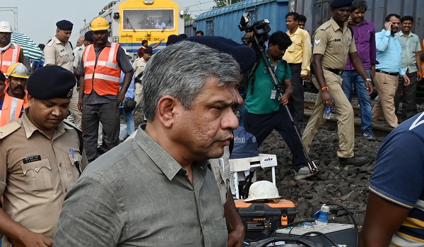 (Ashwini Vaishnaw (kelabu) tiba di tapak kemalangan tiga kereta api