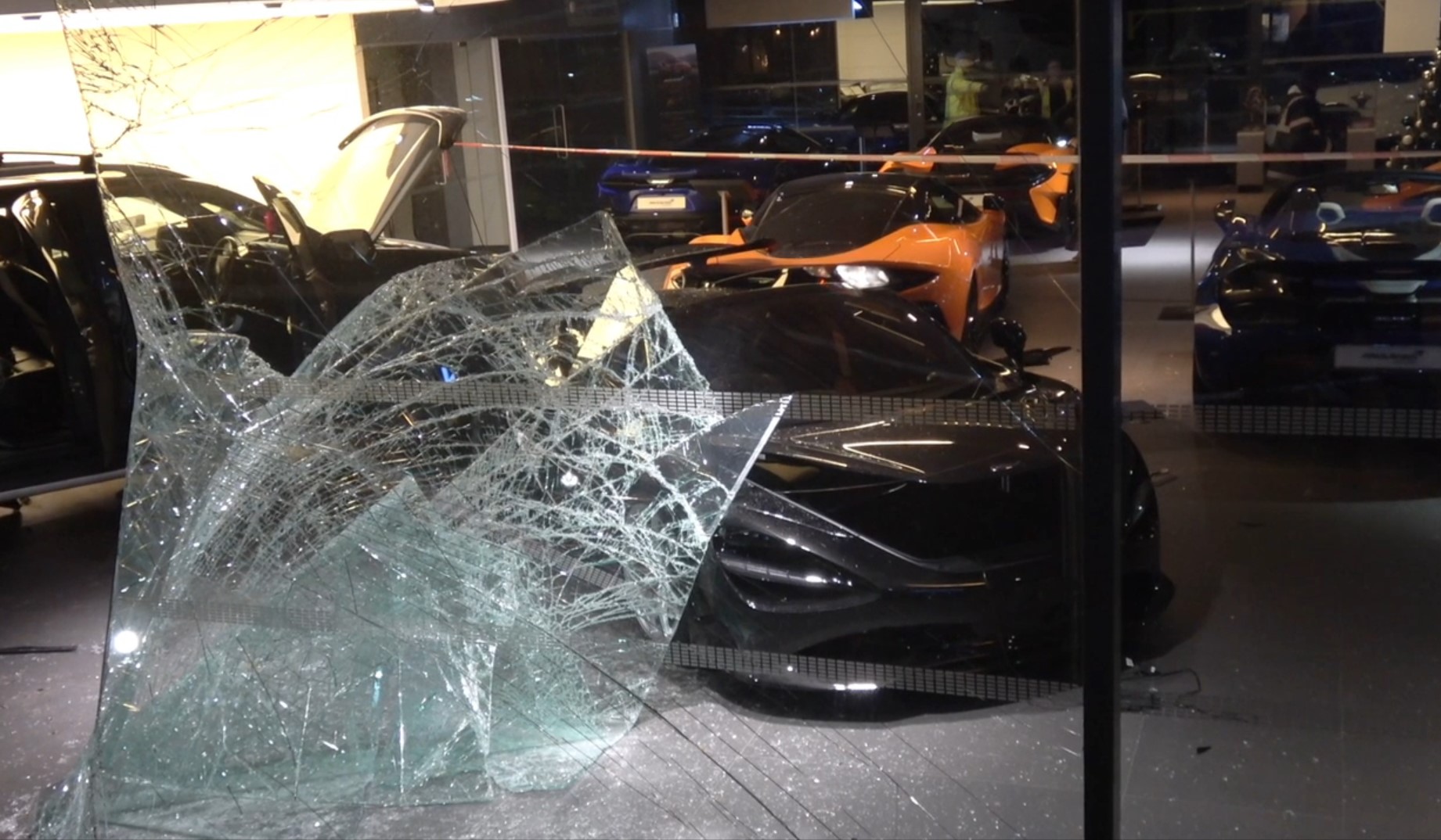 ‘Solihull Live’ melaporkan, bilik pameran itu mengalami kerosakan besar apabila kenderaan pikap tersebut merempuh cermin kaca sebelum melanggar dua supercar.