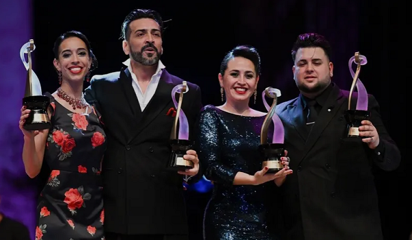 (Constanza Vieyto (kiri) dan Ricardo Astrada (dua kiri ), bergambar bersama pemenang kategori Pista Tango Style