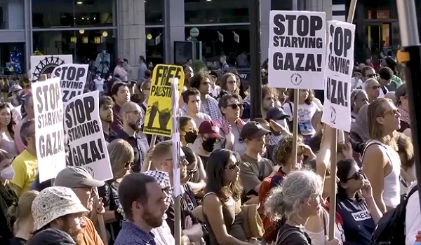 Dengan laungan slogan ‘hentikan kebuluran di Gaza sekarang!’, para penunjuk perasaan memegang sepanduk dengan mengecam tindakan kerajaan Israel menyekat bantuan kemanusiaan serta mengkritik sokongan Amerika Syarikat terhadap serangan tentera Israel di wilayah berkenaan.