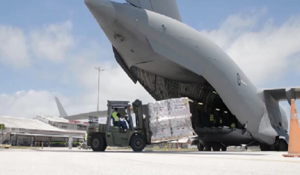 Rakaman yang disediakan Jabatan Pertahanan Australia menunjukkan kapal pengangkut tentera Globemaster C-17A Australia mendarat di Lapangan Terbang Antarabangsa Fuaʻamotu, membawa peralatan penyahgaram, khemah dan dapur.