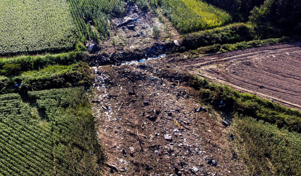 Gambar dron tempat kejadian menunjukkan serpihan pesawat Antonov An-12 bertaburan di ladang.