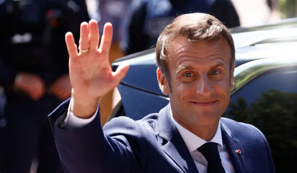 ((Emmanuel Macron melambai ketika meninggalkan pusat pengundian selepas mengundi pada pusingan pertama pilihan raya parlimen Perancis/REUTERS)