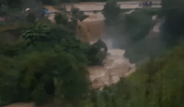 Aliran air yang kuat dilihat turun dari kawasan tinggi gunung menghalang sebahagian besar laluan konkrit.