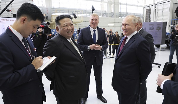 (Kim Jong Un dan Vladimir Putin di Kosmodrom Vostochny di rantau Amur Rusia, semalam/