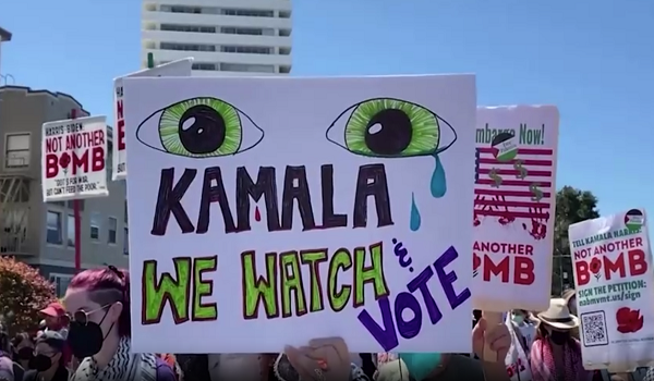 Membawa papan tanda dengan mesej seperti ‘Kamala, kami menonton dan mengundi’, penunjuk perasaan berarak menggesa gencatan senjata di Gaza dan sekatan senjata ke atas Israel.