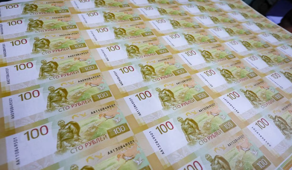 (Wang kertas 100 rubel Rusia yang baru yang cetak di kilang percetakan Goznak di Moscow,
