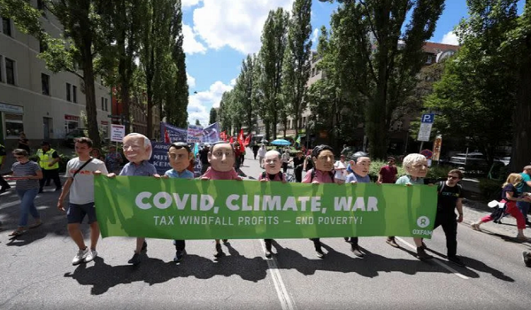 (Penunjuk perasaan membawa sepanduk berarak menjelang sidang kemuncak pemimpin G7