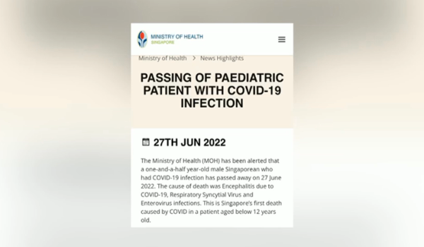 Kementerian Kesihatan Singapura memaklumkan, ia merupakan kematian pertama membabitkan pesakit COVID-19, bawah 12 tahun.
