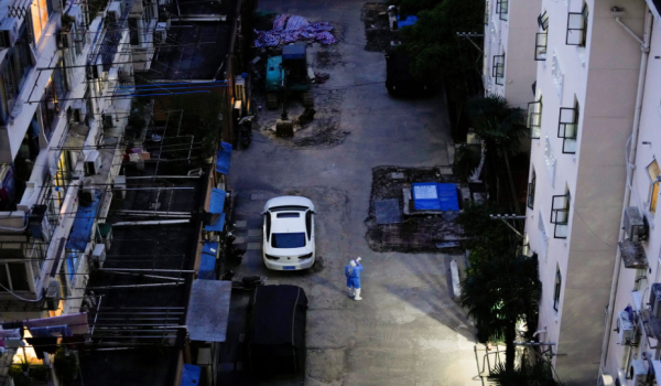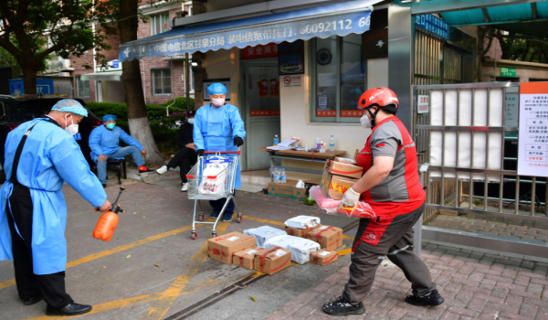 (Seorang pekerja penghantaran membawa bungkusan di pintu masuk ke kediaman yang dikenakan perintah berkurung di Shanghai pada 18 April 2022/REUTERS)