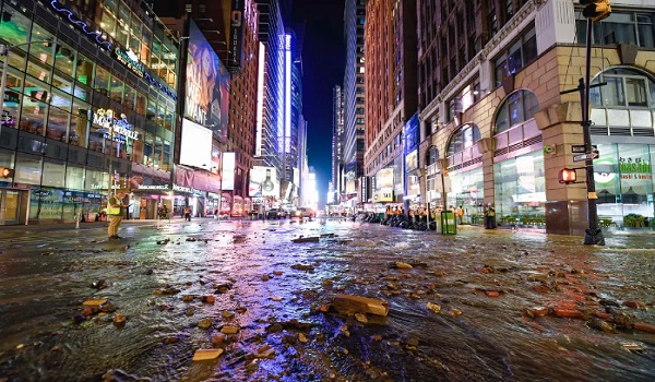 Pihak Berkuasa Pengangkutan Metropolitan (MTA) mengeluarkan video dan gambar menunjukkan air yang mengalir ke stesen Times Square-42nd Street di tengah-tengah Manhattan pada kira-kira pukul 03:00 pagi.