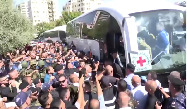 RAMALLAH, 13 Oktober – Dua buah bas yang membawa tahanan Palestin yang dibebaskan dari penjara Israel tiba di Ramallah, sebagai sebahagian daripada perjanjian gencatan senjata.