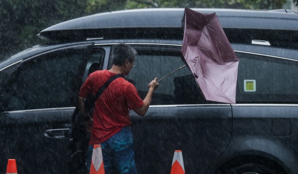 (Tiupan angin kencang akibat Taufan Haikui merosakkan payung seorang lelaki/AFP)