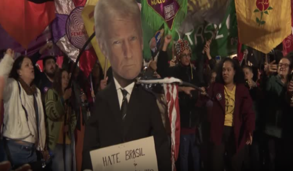 Para peserta membakar patung Donald Trump dan bendera AS sambil melaungkan slogan seperti “Brazil milik kita”.