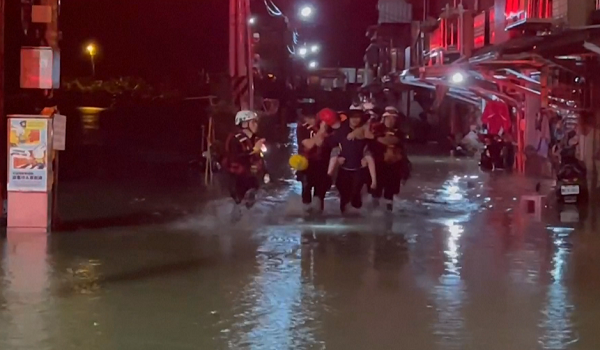 Rakaman televisyen menunjukkan banjir teruk di beberapa bahagian di daerah timur Yilan.
