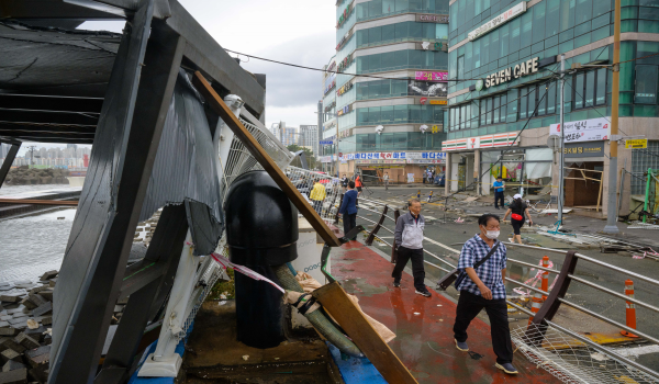 Sebelum membadai bandar pelabuhan Busan, yang mengakibatkan kerosakan jalan dan kedai berhampiran pantai.