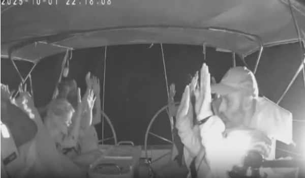Siaran langsung dari salah sebuah kapal menunjukkan para penumpang memakai jaket keselamatan sambil duduk di dek.