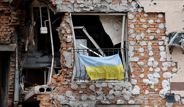 (Bendera Ukraine digantung di balkoni bangunan kediaman yang musnah di Irpin, Ukraine/AFP)