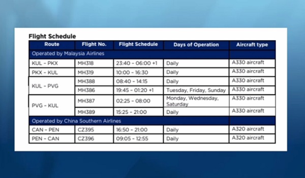 KUALA LUMPUR, 10 Julai- China Southern Airlines dan Malaysia Airlines dengan mengumumkan perkongsian kod penerbangan mereka bagi laluan Guangzhou-Pulau Pinang.